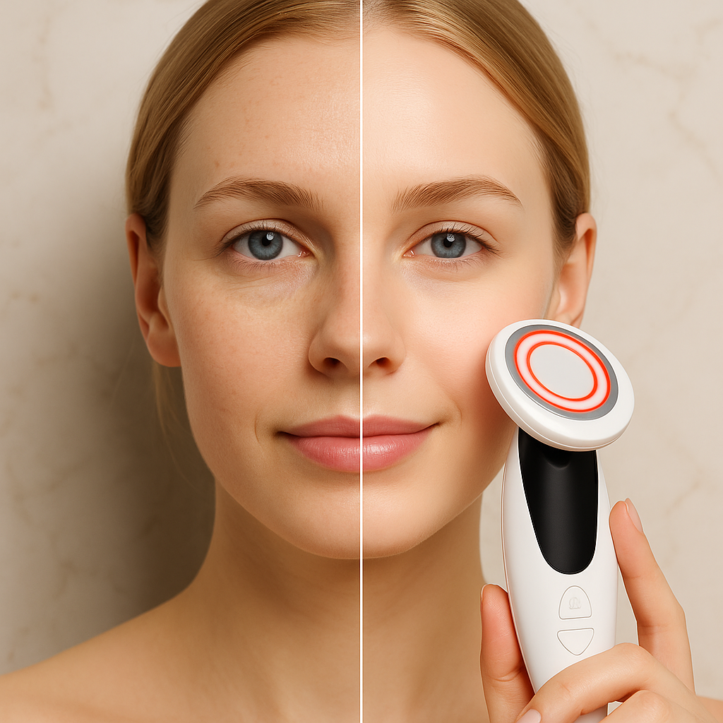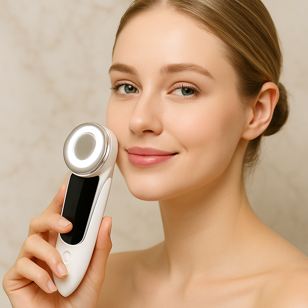 A next-gen 7-in-1 lifting device combining EMS, microcurrent, gentle vibration, soothing heat and LED light therapy for face & neck. USB-C rechargeable, ergonomic, and travel-ready.